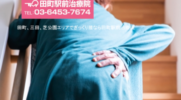 ぎっくり腰による突然の激しい腰の痛みでお困りの方は、田町駅前治療院へ。田町駅西口徒歩3分・三田駅A3/A7出口から徒歩30秒・芝公園駅A2出口から徒歩10分の鍼灸整骨院で、鍼治療・マッサージ・理学療法機器を組み合わせ、症状に合わせた的確な施術をご提供いたします。早期回復と再発予防をサポートし、予約不要でもご来院いただけます。早めの治療をお勧めいたします。